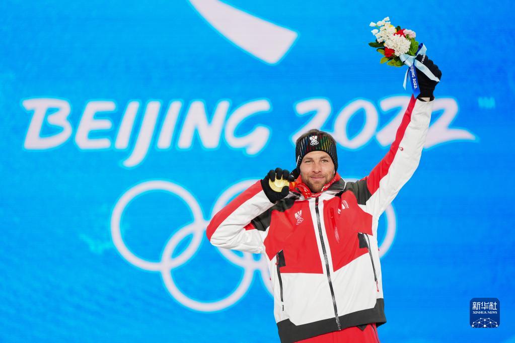 2月8日,單板滑雪男子平行大回轉比賽冠軍、奧地利選手本亞明·卡爾在獎牌頒發(fā)儀式上。新華社記者 朱崢 攝