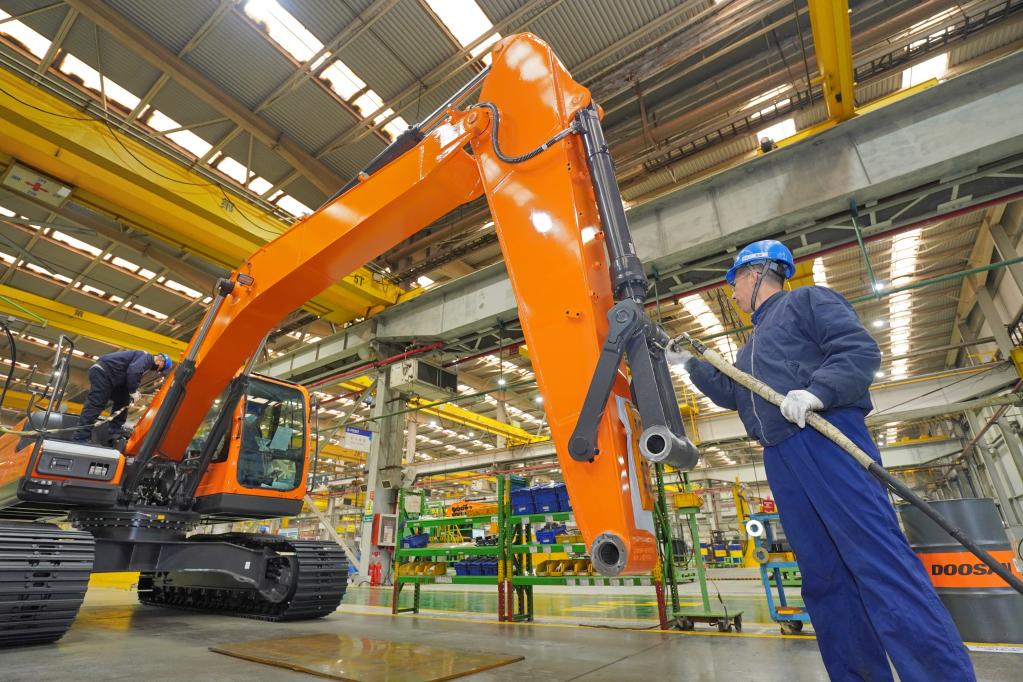 2月7日,在山東煙臺一家工程機械生產企業(yè),工人在生產車間內忙碌。新華社發(fā)(唐克攝)