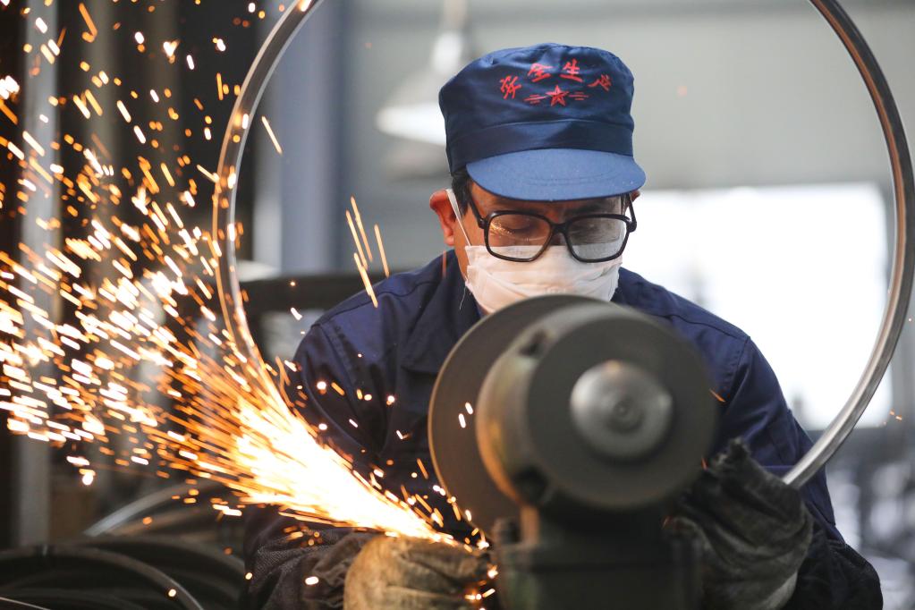 2月7日,在浙江省杭州市臨安區(qū)天目山鎮(zhèn)一家外貿企業(yè),工人在拋光自行車鋼圈。新華社發(fā)(胡劍歡攝)