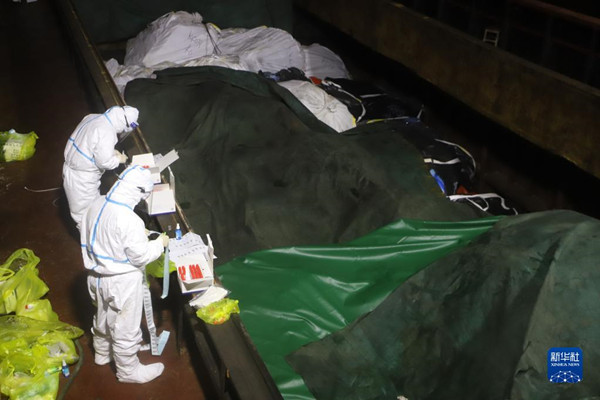 中國海警局直屬第二局執(zhí)法員對涉案凍品進行取樣檢測(2月12日攝)。新華社發(fā)(張淼 攝)