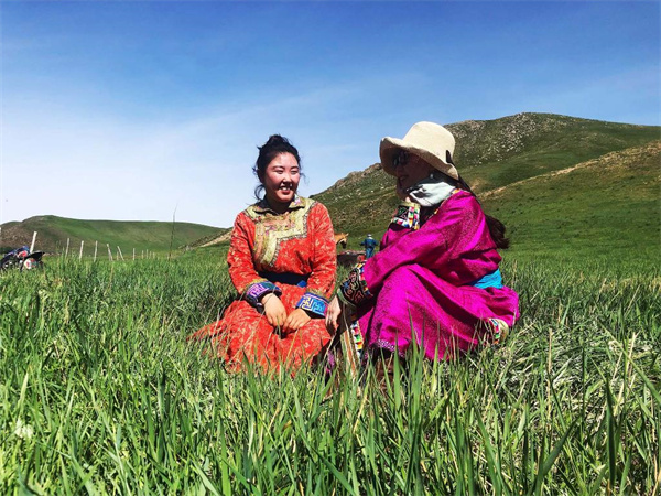 哈斯薩日嘎(左)與游客在草原上聊天。圖片由受訪(fǎng)者提供