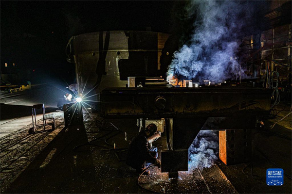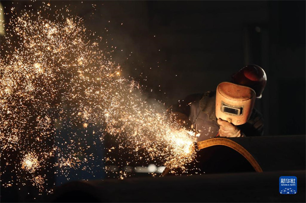 在沈陽(yáng)北方重工集團(tuán)有限公司,工人在車(chē)間焊接產(chǎn)品(2022年3月24日攝)。 新華社發(fā)