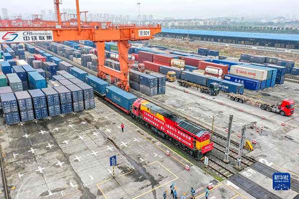 中歐班列(重慶)第10000列列車(chē)在重慶團(tuán)結(jié)村中心站等待發(fā)車(chē)(2022年6月23日攝,無(wú)人機(jī)照片)。新華社記者 黃偉 攝