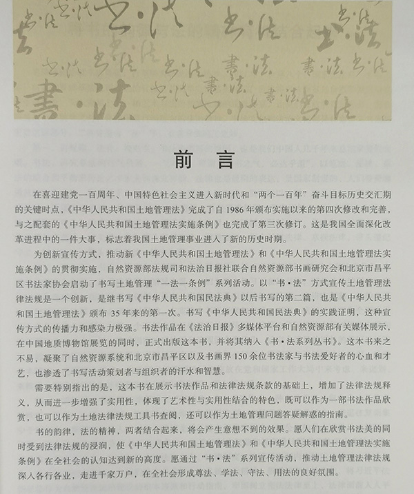 書以馭字,法以興邦;書法一體,墨法同彰。本書既可以作為一部書法作品欣賞,也可以作為土地法律法規(guī)工具書查閱,還可以作為土地管理問題答疑解惑的指南。希望這套叢書可以讓讀者在欣賞書法美的同時(shí)受到法律法規(guī)的浸潤,推動土地管理法律法規(guī)深入各行各業(yè)、走進(jìn)千家萬戶,在全社會形成尊法、學(xué)法、守法、用法的良好氛圍。
