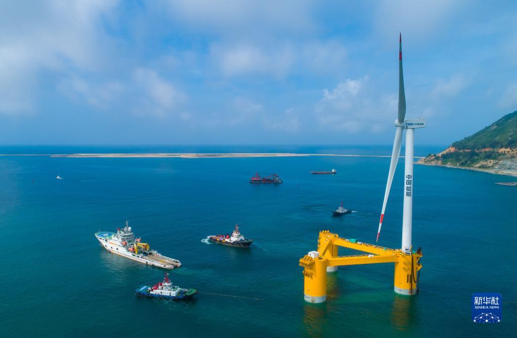 國內(nèi)首臺(tái)深遠(yuǎn)海浮式風(fēng)電裝備“扶搖號(hào)”從廣東省茂名市廣港碼頭拖航前往羅斗沙海域進(jìn)行示范應(yīng)用(2022年5月29日攝,無人機(jī)照片)。新華社記者 劉大偉 攝