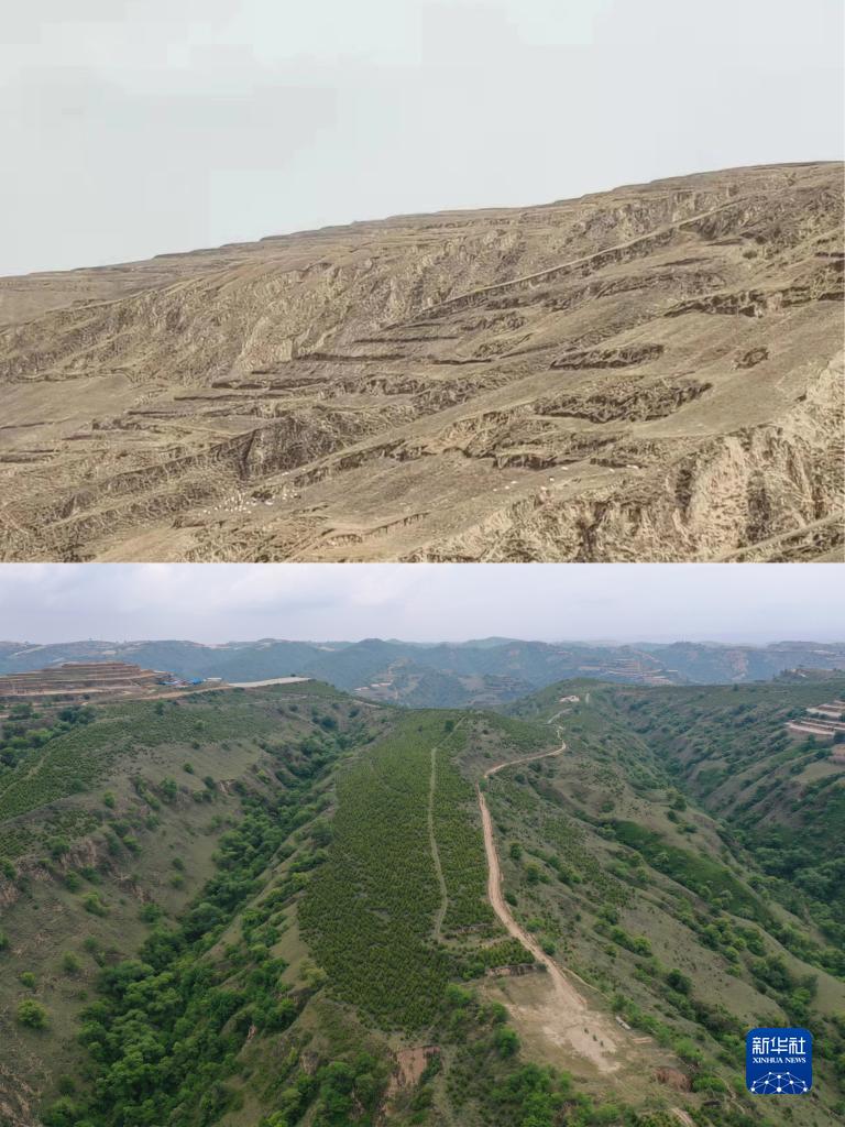 拼版照片:上圖為2013年拍攝的甘肅省慶陽市華池縣南梁鎮(zhèn)高臺村荒山景象(資料圖片,華池縣自然資源局供圖);下圖為2022年5月25日拍攝的甘肅省慶陽市華池縣南梁鎮(zhèn)高臺村萬畝苗林示范點(diǎn)景象(無人機(jī)照片,新華社記者杜哲宇攝)。新華社發(fā)