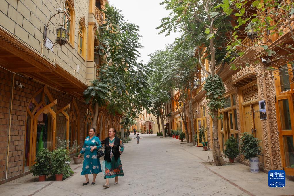 這是在新疆和田市拍攝的由北京市援疆資金支持改造的團(tuán)城(2019年8月1日攝)。為改善居住環(huán)境,保持和田歷史文化街區(qū)風(fēng)貌,當(dāng)?shù)乩帽本┦性Y金,對和田老城區(qū)進(jìn)行保護(hù)、安居、旅游與就業(yè)四位一體的改造。新華社發(fā)(許珠珠 攝)