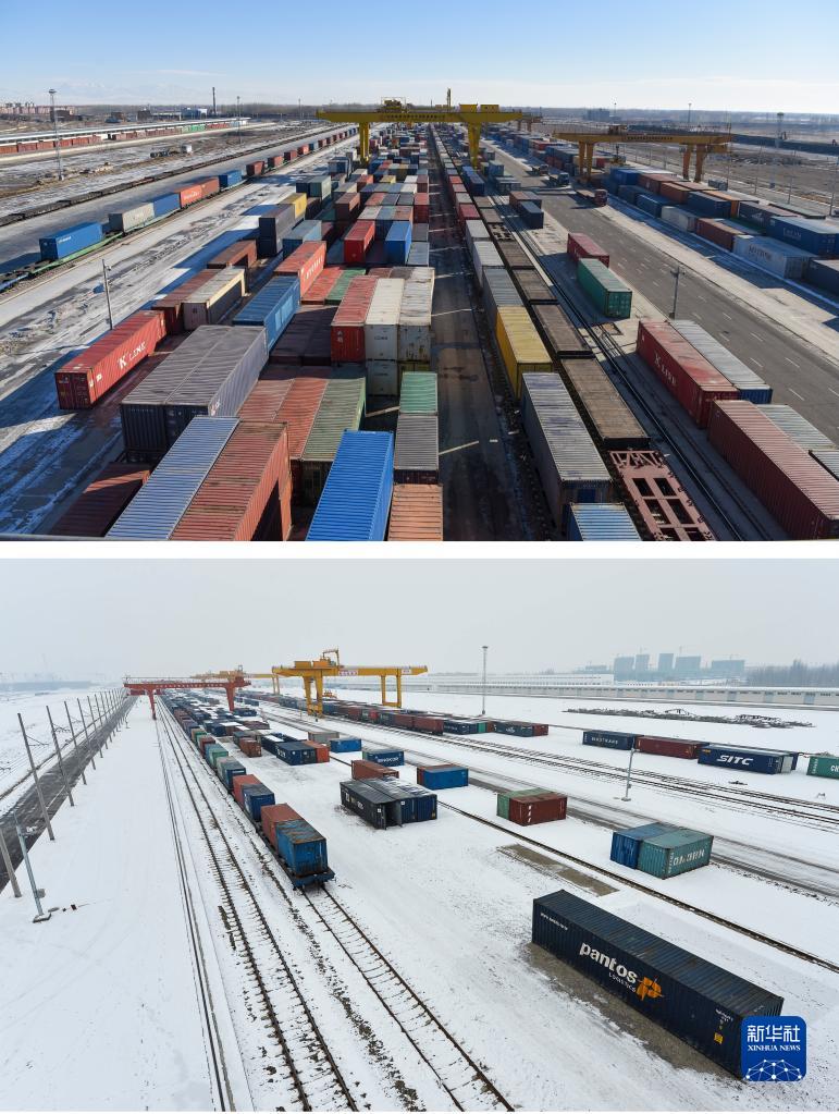 拼版照片:上圖為2021年2月6日拍攝的新疆霍爾果斯鐵路口岸換裝場內(nèi)的換裝作業(yè)場景(新華社記者 丁磊 攝);下圖為2013年12月25日拍攝的新疆霍爾果斯火車站換裝場(新華社記者 江文耀 攝)。新華社發(fā)