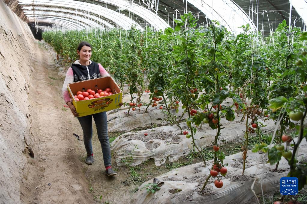 在新疆莎車縣伊什庫力鄉(xiāng)設(shè)施農(nóng)業(yè)基地,種植戶搬運(yùn)剛采摘的西紅柿(2020年3月18日攝)。該設(shè)施農(nóng)業(yè)基地是在上海援疆莎車分指揮部協(xié)調(diào)推動下建立的。新華社記者 丁磊 攝