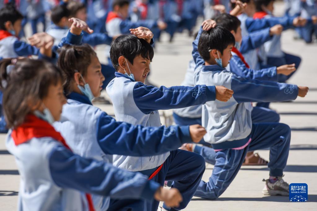 在新疆阿克蘇地區(qū)烏什縣依麻木鎮(zhèn)國家通用語言小學(xué),學(xué)生們在做課間操(2022年6月8日攝)。新華社記者 丁磊 攝