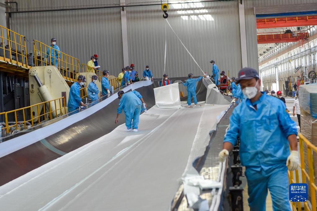 新疆生產(chǎn)建設兵團新星經(jīng)濟技術開發(fā)區(qū)一家風電葉片企業(yè)的員工在車間忙碌(2022年7月27日攝)。新華社記者 丁磊 攝