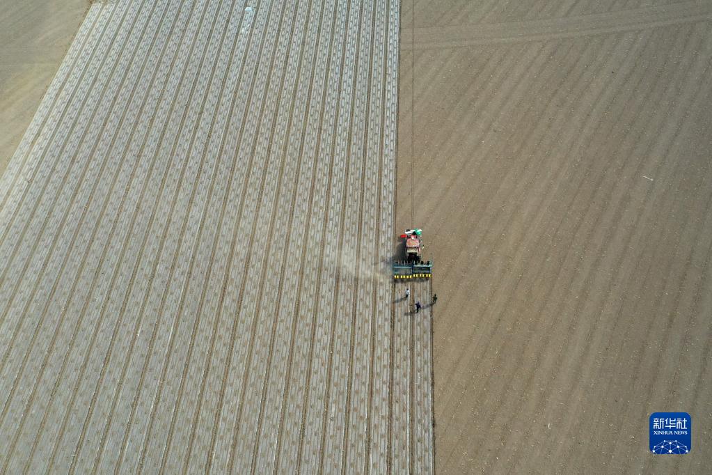 在新疆生產(chǎn)建設兵團第六師共青團農(nóng)場的棉田里,職工操作搭載北斗導航系統(tǒng)的播種機進行春播(2022年4月19日攝,無人機照片)。新華社記者 丁磊 攝