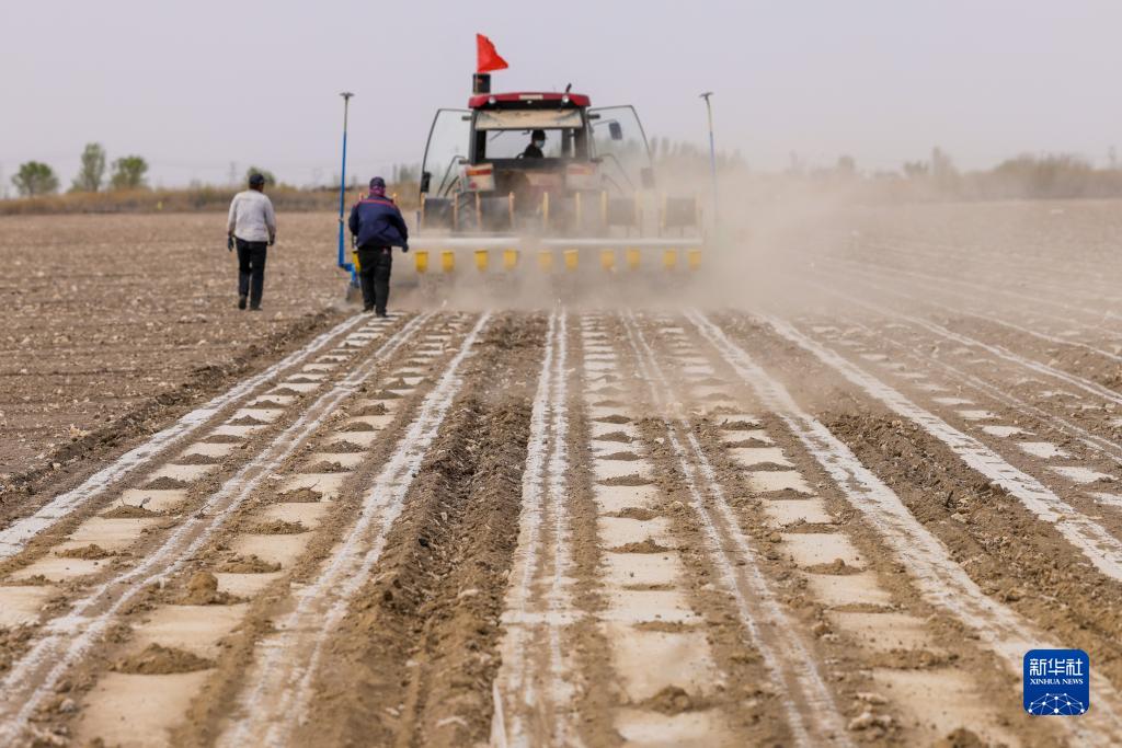 在新疆生產(chǎn)建設兵團第六師共青團農(nóng)場的棉田里,職工操作搭載北斗導航系統(tǒng)的播種機進行春播(2022年4月19日攝)。新華社記者 丁磊 攝