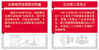 十年來(lái),法律規(guī)范體系更加完備。加快建設(shè)中國(guó)特色社會(huì)主義法治體系,全面加強(qiáng)憲法實(shí)施和監(jiān)督,編纂民法典,制定香港特別行政區(qū)維護(hù)國(guó)家安全法,修改完善香港選舉制度,截至2022年6月底,制定修改法律行政法規(guī)730余件次,現(xiàn)行有效法律292件,行政法規(guī)598件,中國(guó)特色社會(huì)主義法律體系日趨科學(xué)完善。
