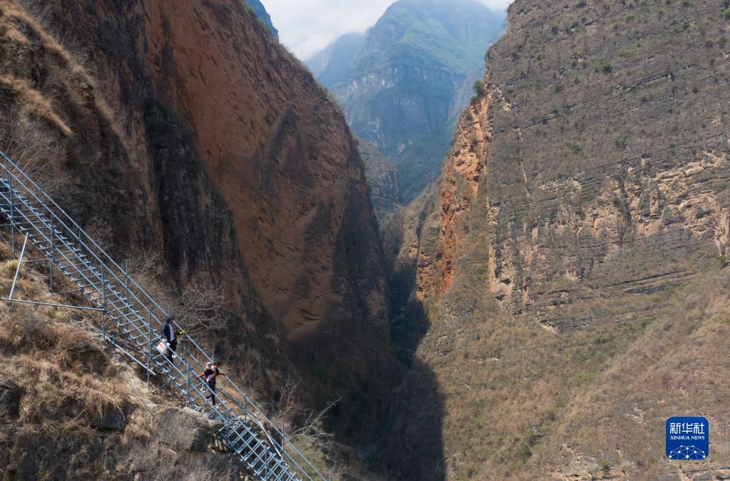 2020年5月13日,四川省涼山彝族自治州昭覺縣支爾莫鄉(xiāng)“懸崖村”——阿土列爾村高山區(qū)的貧困戶沿著鋼梯下山,準(zhǔn)備搬進(jìn)昭覺縣城易地扶貧搬遷安置點(diǎn)的新家(無人機(jī)照片)。新華社記者 江宏景 攝