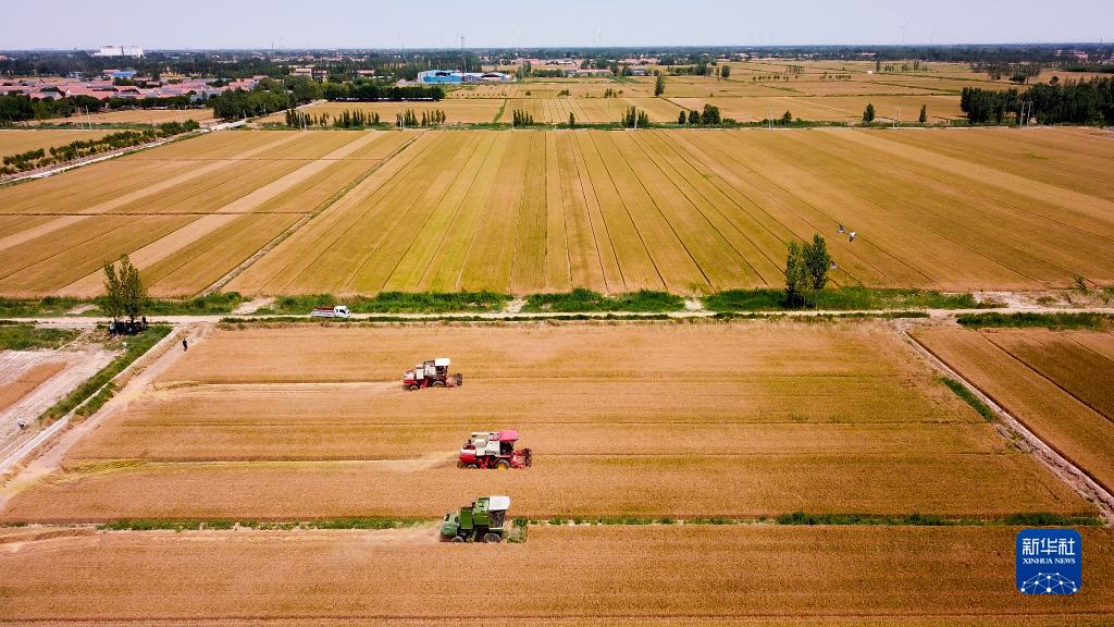 2022年6月7日,在山東省惠民縣桑落墅鎮(zhèn),農(nóng)民駕駛農(nóng)機(jī)收獲小麥(無人機(jī)照片)。新華社記者 郭緒雷 攝