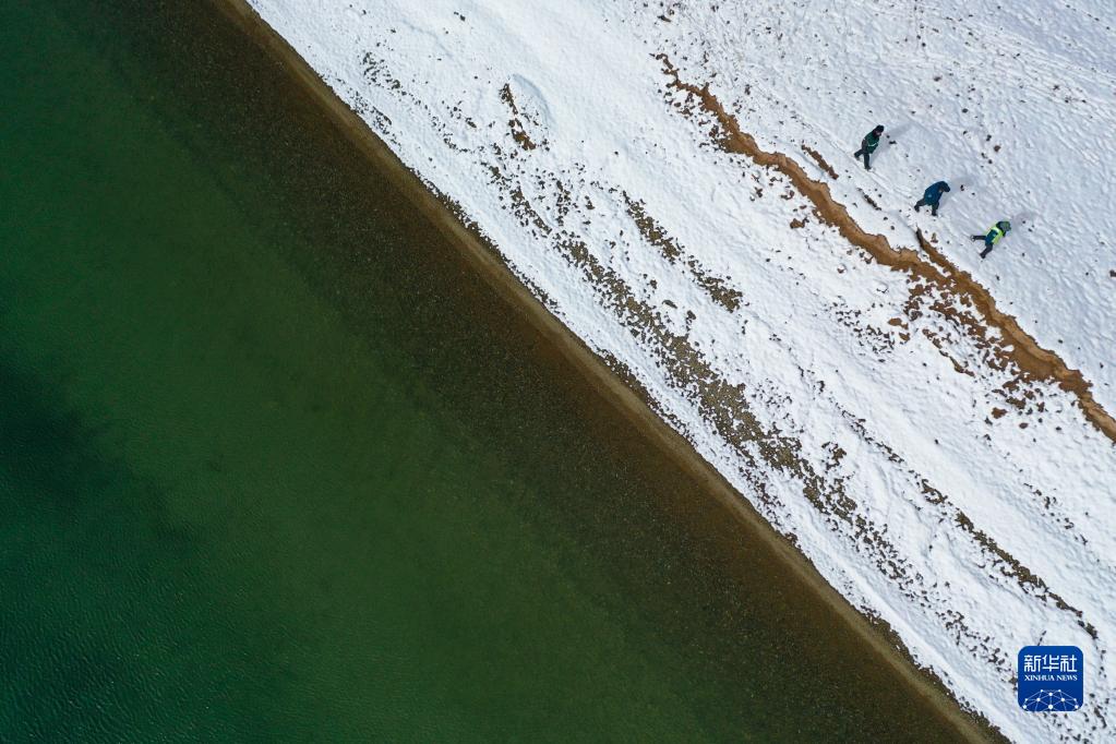 在青海省果洛藏族自治州瑪多縣扎陵湖鄉(xiāng)勒那村,三江源國家公園黃河源園區(qū)生態(tài)管護(hù)員在巡護(hù)(2021年10月20日攝,無人機照片)。 新華社記者 張龍 攝