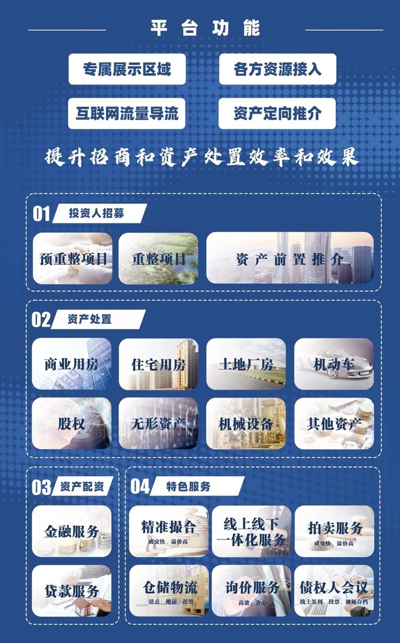 作為該信息平臺的共建方,京東拍賣將發(fā)揮信息化與資源整合的優(yōu)勢,為常州市危困與重整企業(yè)的資產(chǎn)提供全鏈路的推介與處置服務(wù)。針對破產(chǎn)標(biāo)的處置,該信息平臺將為常州地區(qū)破產(chǎn)企業(yè)提供資產(chǎn)專屬展示區(qū),包括投資人招募、資產(chǎn)處置、資產(chǎn)配資以及特色服務(wù)等多個功能化模塊。其中,資產(chǎn)處置模塊包括商業(yè)用房、住宅用房、土地廠房、機動車、股權(quán)、無形資產(chǎn)、機械設(shè)備以及其他資產(chǎn)等細(xì)分內(nèi)容。
