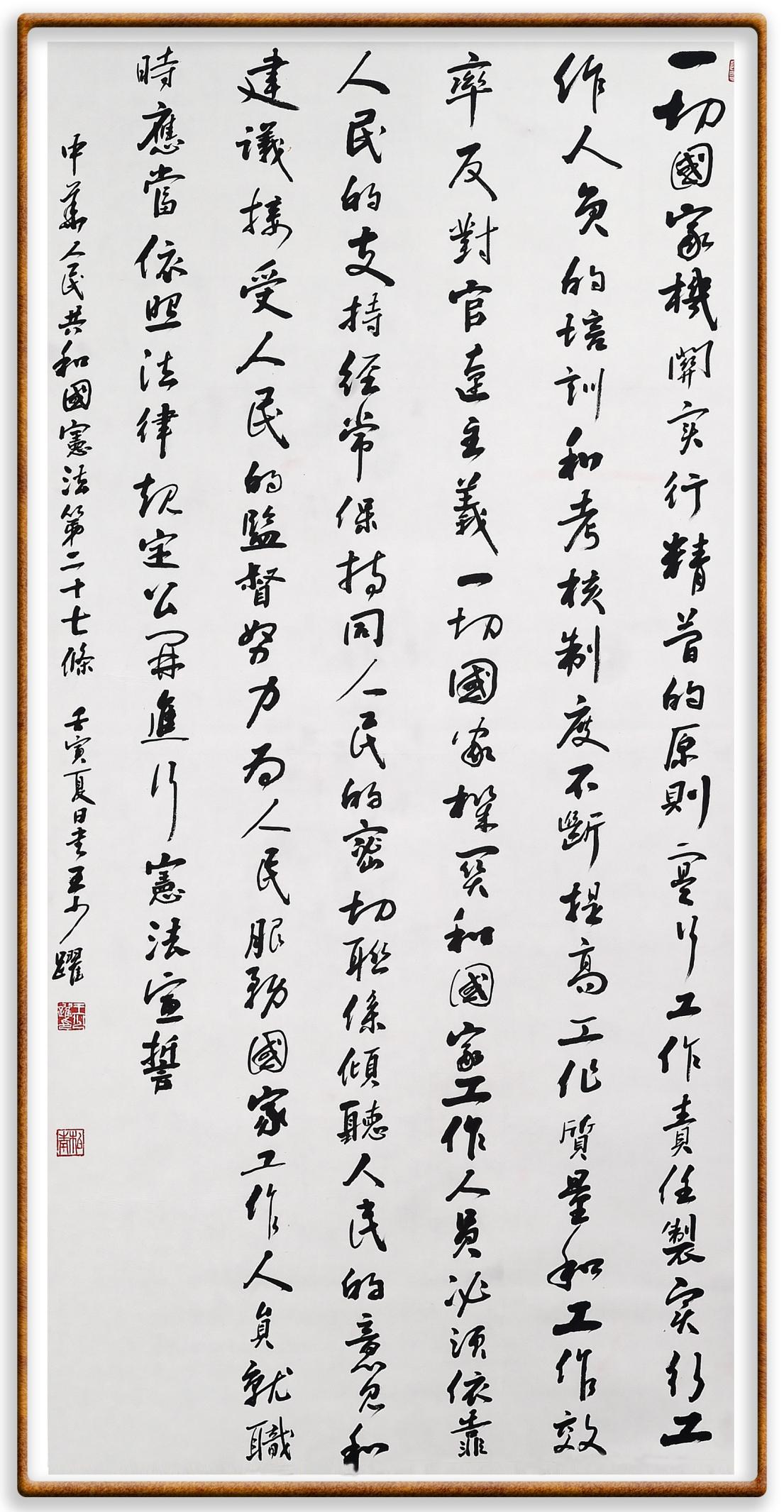 繼《中華人民共和國民法典》《中華人民共和國土地管理法》《中華人民共和國土地管理法實施條例》《中華人民共和國法律援助法》之后,法治日報社聯(lián)合北京市司法局、北京書法家協(xié)會,將筆端對準(zhǔn)《中華人民共和國憲法》和《中華人民共和國行政處罰法》。